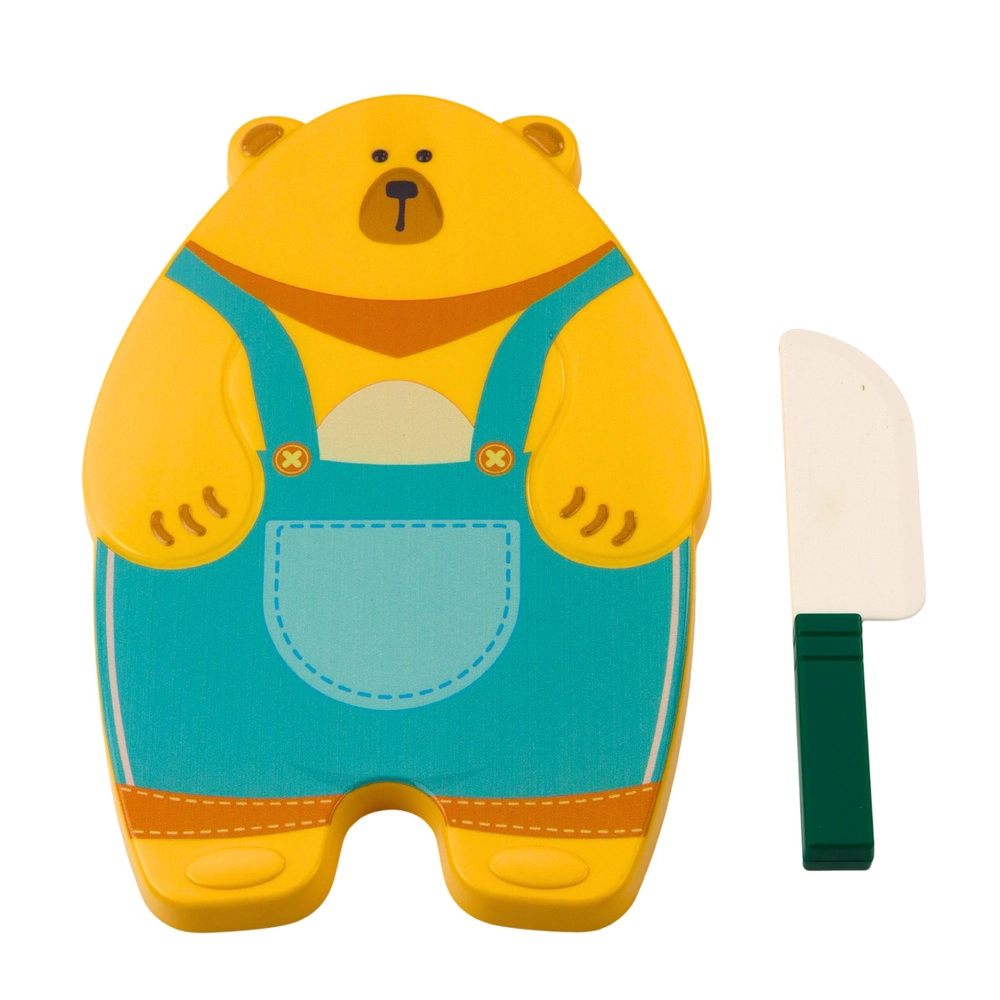 Une planche stable en forme d’ourson et un petit couteau léger et sûr créent un environnement de cuisine authentique pour les petits chefs.