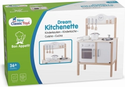 Une cuisine en bois élégante pour enfants, de couleur blanche, offre aux enfants dès 3 ans des heures de jeu créatif. Elle comprend une plaque de cuisson à deux feux, un four avec porte transparente, un évier amovible, des étagères de rangement et une horloge avec aiguilles mobiles. Sont inclus un faitout avec couvercle, une poêle, 3 ustensiles en bois et une salère avec poivrière – tout pour un jeu de cuisine réaliste et le développement des compétences sociales.