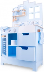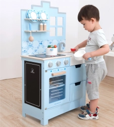 Cette cuisine pour enfants au design bleu clair crée un espace idéal pour les jeux d’imitation culinaires. Elle comprend un évier avec robinet, un four avec hublot, un four à micro-ondes et de nombreuses étagères et tiroirs pratiques pour ranger les accessoires. Des détails réalistes, comme les boutons rotatifs, la porte du four et les ustensiles suspendus, stimulent les sens et encouragent naturellement l’autonomie des enfants.
