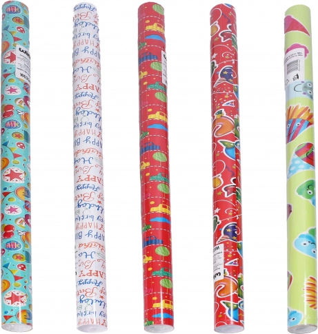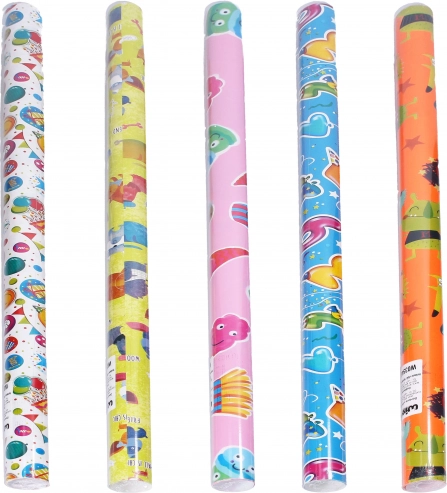 Papier cadeau enfant mix 0,7 × 2 m aux motifs joyeux. Se découpe facilement, garde sa forme et est idéal pour emballer les cadeaux d’anniversaire.