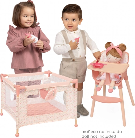 DeCuevas Tulipe 2 en 1 : parc de jeu et chaise haute pour poupées jusqu’à 36 cm. Design tulipe pastel, finition de qualité, manipulation facile. À partir de 3 ans.