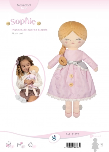 Nous vous présentons la ravissante poupée en peluche Sophie de 36 cm de la nouvelle collection 2025. Elle est fabriquée en peluche brillante de haute qualité, douce et légère, idéale pour les câlins et les voyages. La poupée est lavable à la main à 30 °C et séduit par son délicat design espagnol dans des tons rose pâle avec des détails gris et blancs.