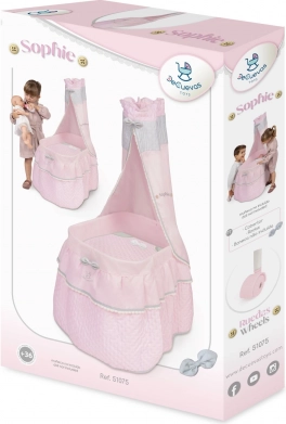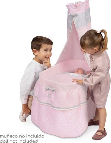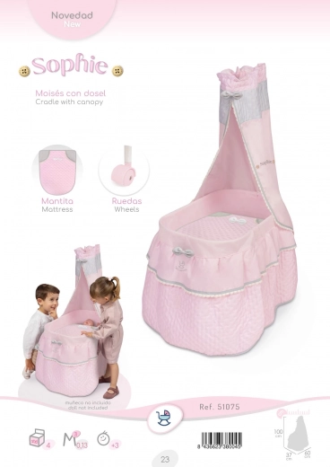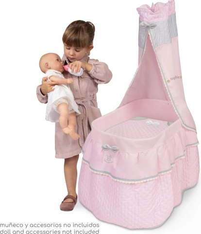 Un ravissant lit à roulettes pour poupées de la collection Sophiebaldaquin avec dentelle délicate, une couette avec petit nœud et 4 roulettes pivotantes pour un déplacement fluide dans toutes les directions. Sa structure légère, axée sur une finition soignée et un design espagnol, est idéale pour le jeu des enfants dès 3 ans.