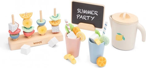 Ce joyeux set de jeu en bois apporte tout ce dont les enfants ont besoin pour préparer des limonades et des gourmandises fruitées. Il suffit de remplir le gobelet, d’ajouter des tranches de fruits, de décorer avec une paille et le service peut commencer. Les enfants peuvent mélanger différentes combinaisons, inventer leurs propres recettes et développer leur imagination en jouant au pique-nique ou au stand de rafraîchissements.
