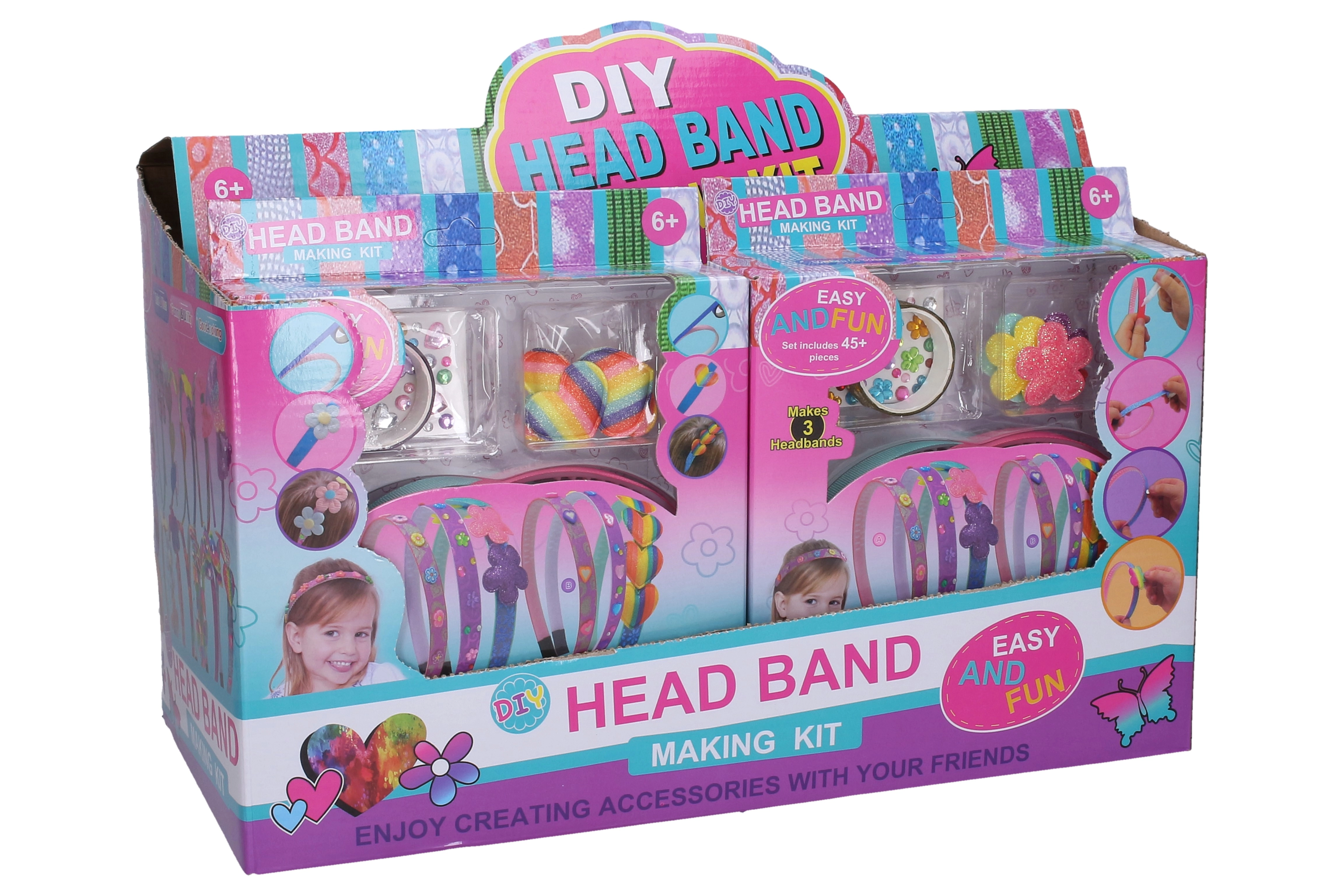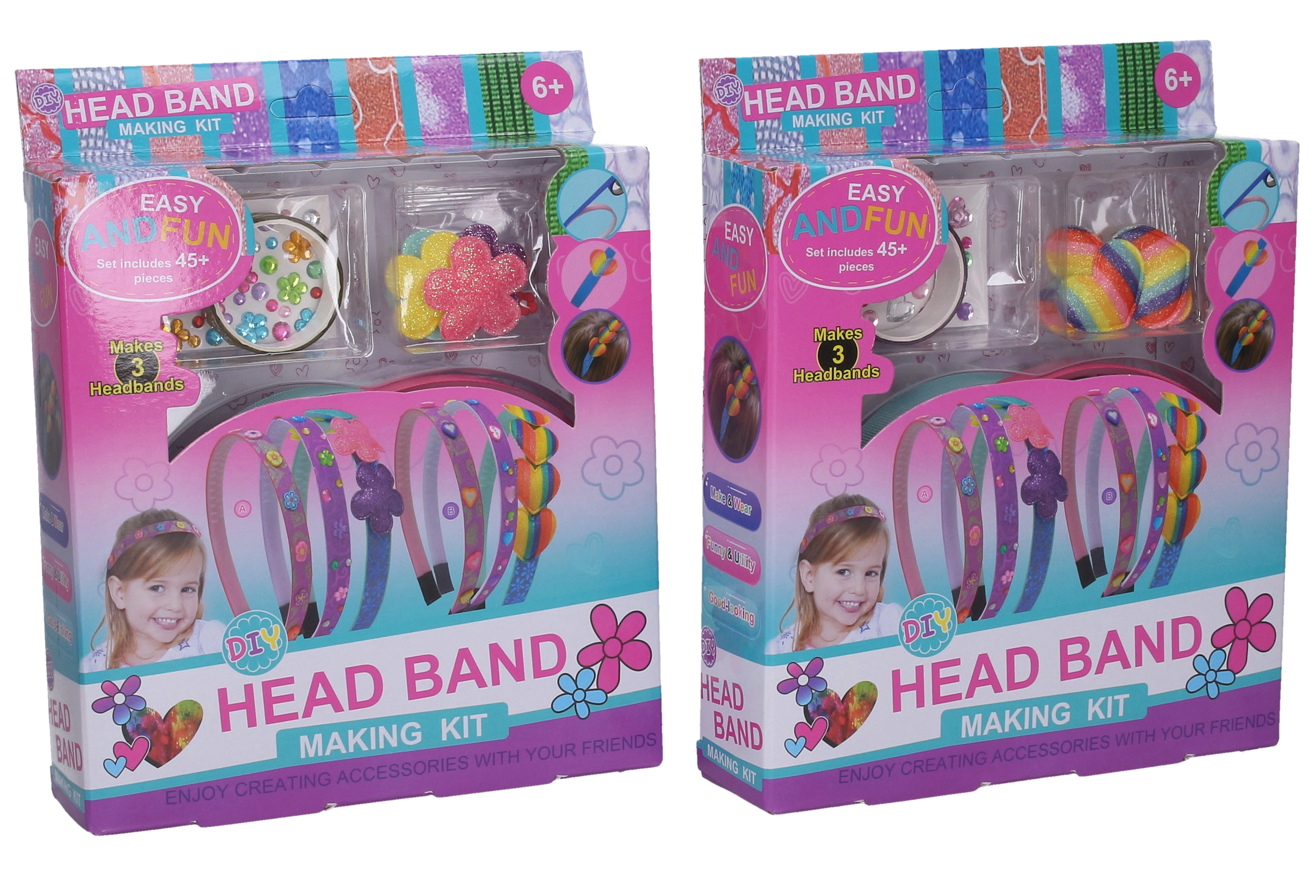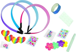 Le kit comprend des serre-têtes en plastique de base et un large choix d’accessoires, pour que les enfants conçoivent facilement trois styles différents – du floral délicat au scintillant et ludique.
