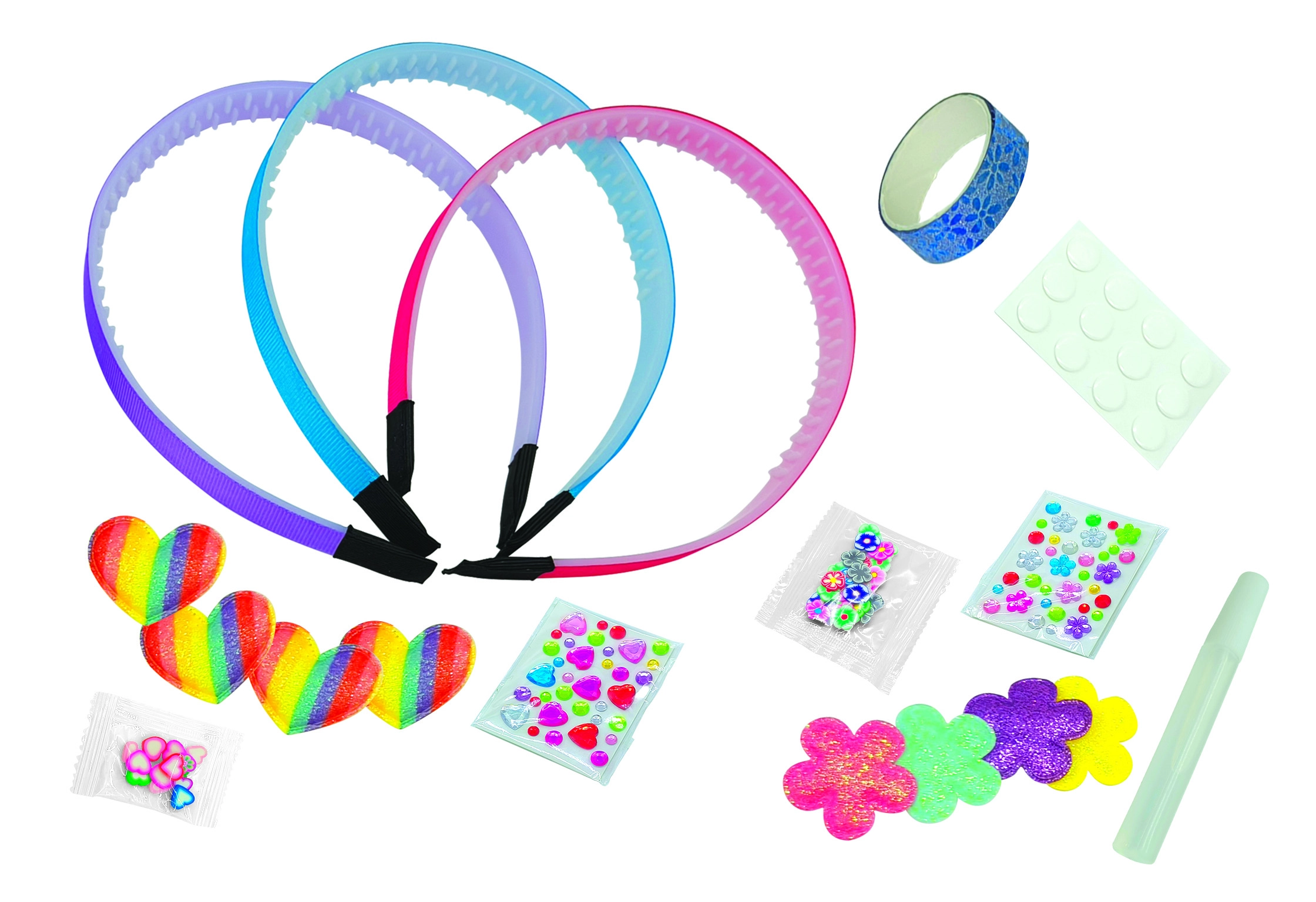 3 serre-têtes, décorations (fleurs, cœurs, strass, paillettes), bande colorée, ruban adhésif double-face, colle, pastilles autocollantes