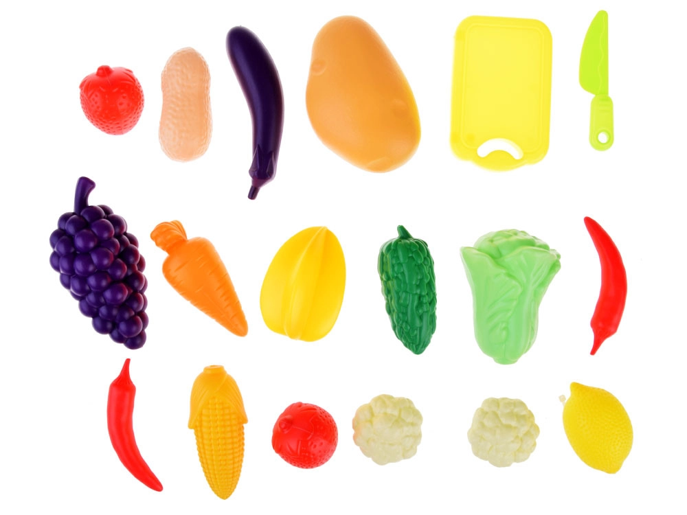 - Ensemble d’accessoires riche – différents fruits et légumes, planche à découper et petit couteau pour imiter la préparation des repas.
