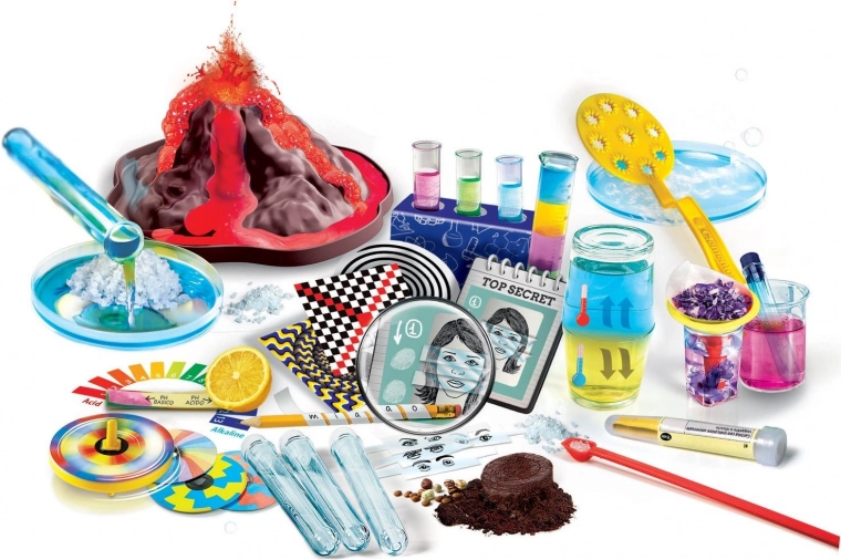- Plus de 30 accessoires : éprouvettes, support, doseurs, outils d’optique, modèle de volcan, manuels/cartes d’activités