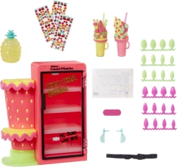 poupée, comptoir de café avec mini réfrigérateur, accessoires pour boissons, capsules d’ongles, vernis, paillettes, lime, colle, stickers