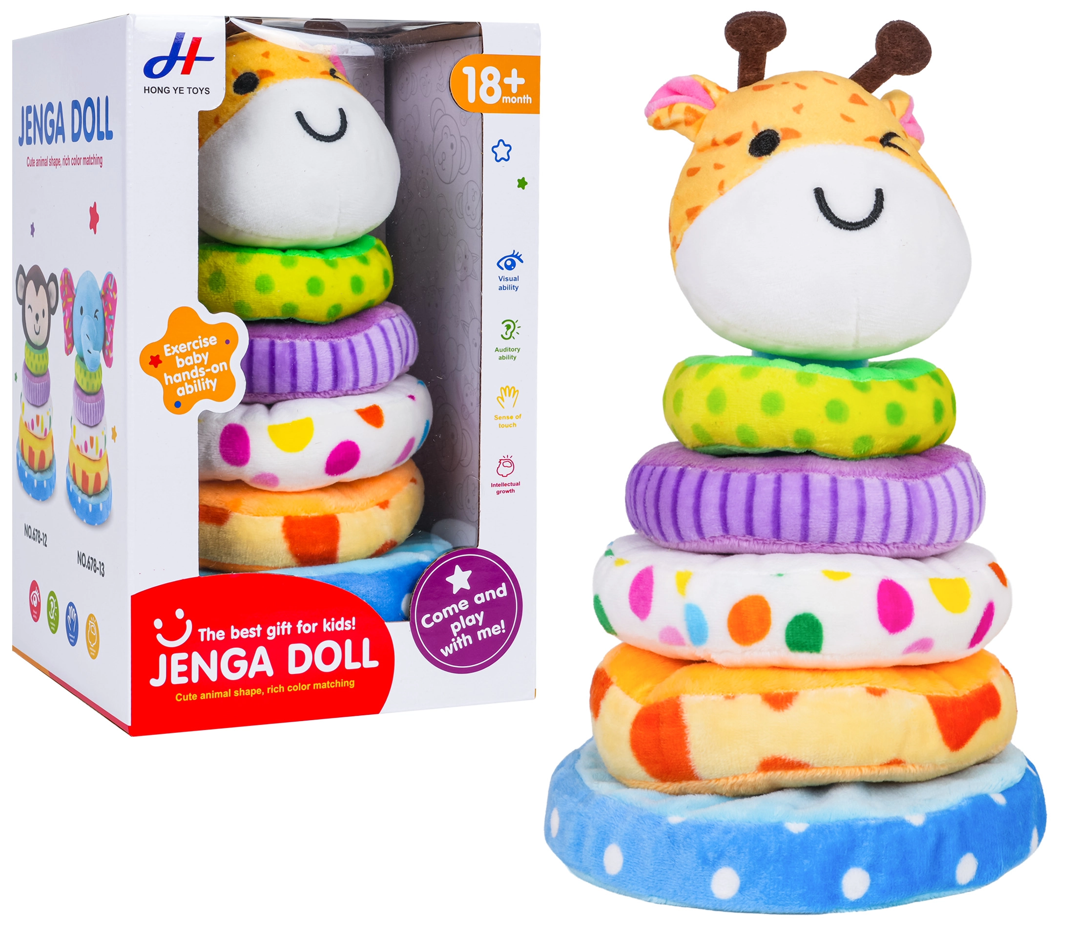 La pyramide empilable souple girafe offre aux enfants une façon ludique et sûre d’apprendre. L’ensemble comprend une base stable, quatre anneaux tout doux de tailles différentes et une tête de girafe avec sifflet. Les motifs colorés et la peluche agréable soutiennent le développement sensoriel, tandis que l’empilement des anneaux entraîne la logique et la patience.