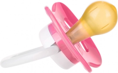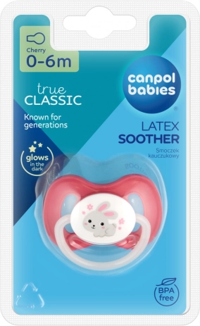 Sucette en caoutchouc Canpol babies forme cerise 0–6 mois, rose. Sans BPA, avec ouvertures de ventilation et anse phosphorescente. Succion naturelle, sûre et confortable.