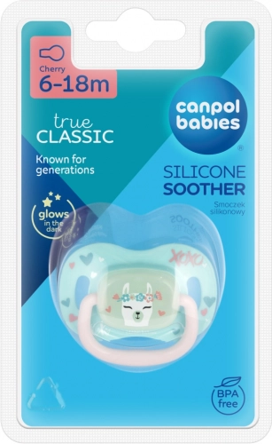 La sucette en silicone Canpol babies à embout rond en forme de cerise pour enfants de 6 à 18 mois offre un silicone 100 % hypoallergénique, une tétine ferme et indéformable et des ouvertures de ventilation pour les peaux sensibles. Des éléments phosphorescents facilitent la recherche dans l’obscurité et une poignée pratique permet une mise en bouche aisée et l’attache à une chaîne. Sans BPA.