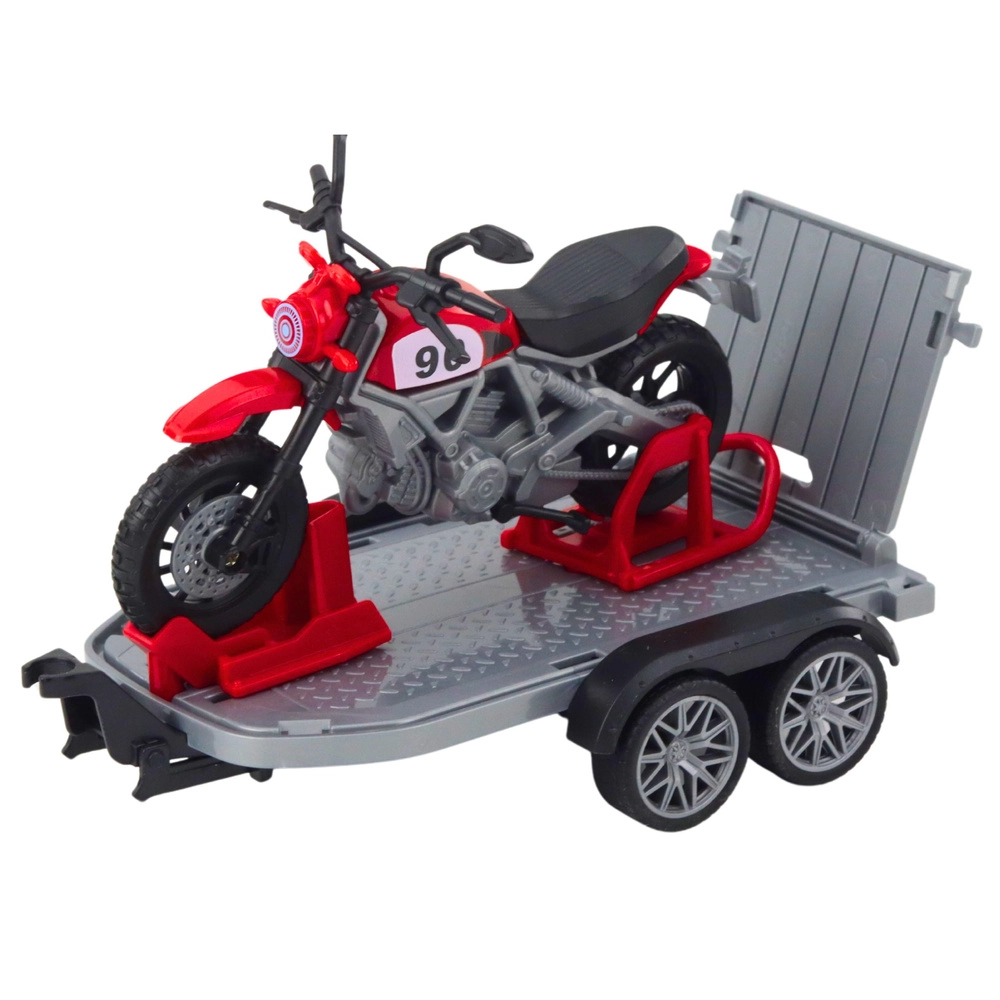 La remorque à deux essieux avec rampe fonctionnelle facilite le chargement de la moto et élargit les possibilités de jeu et de transport.