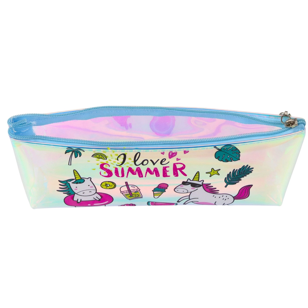 Élégante trousse pour fille au motif estival et licorne, séduisante par sa surface holographique à reflets irisés. Elle possède un corps transparent pour vérifier rapidement le contenu, une fermeture éclair bleue fluide avec un pendentif en forme d’étoile et un intérieur spacieux à compartiment unique pour crayons de couleur, crayons et feutres. Facile à nettoyer et idéale pour le sac à dos.