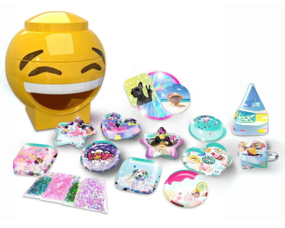 Tout le nécessaire se trouve dans la boîte – de la machine à fabriquer les autocollants aux moules, gabarits et films de protection. Divers ornements comme des paillettes, des strass et des confettis donnent aux autocollants un aspect accrocheur et une texture originale.