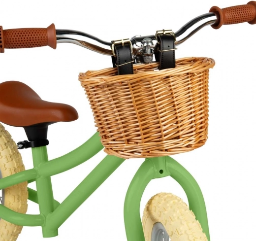 Un élégant panier en osier fixé au guidon pour les petits objets et jouets. Les poignées et la selle marron confèrent à la draisienne un look intemporel.