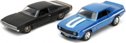 Ce coffret double stylé réunit deux muscle cars classiques en qualité de collection : Chevrolet Camaro 1969 bleue avec bandes blanches et Dodge Charger Wide Body 1968 noire mate. Des proportions réalistes, des lignes de carrosserie nettes et des vitrages transparents renforcent l’atmosphère cinématographique de la saga Fast & Furious.