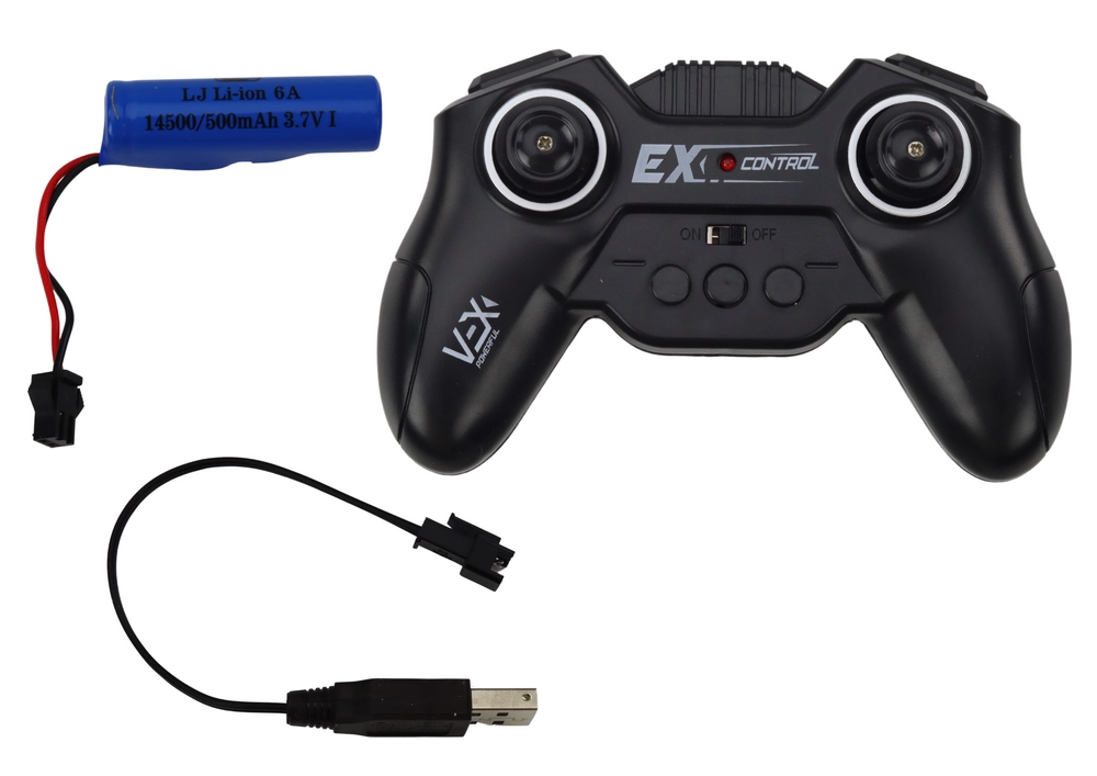 Le coffret comprend la télécommande, une batterie Li‑ion 3,7 V et un câble de charge USB. Il suffit d’insérer des piles dans la télécommande et c’est parti.