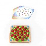 - Plateau de jeu en bois en 2 parties, 6 cartes de jeu thématiques, 20 coccinelles en bois, 28 pièces au total