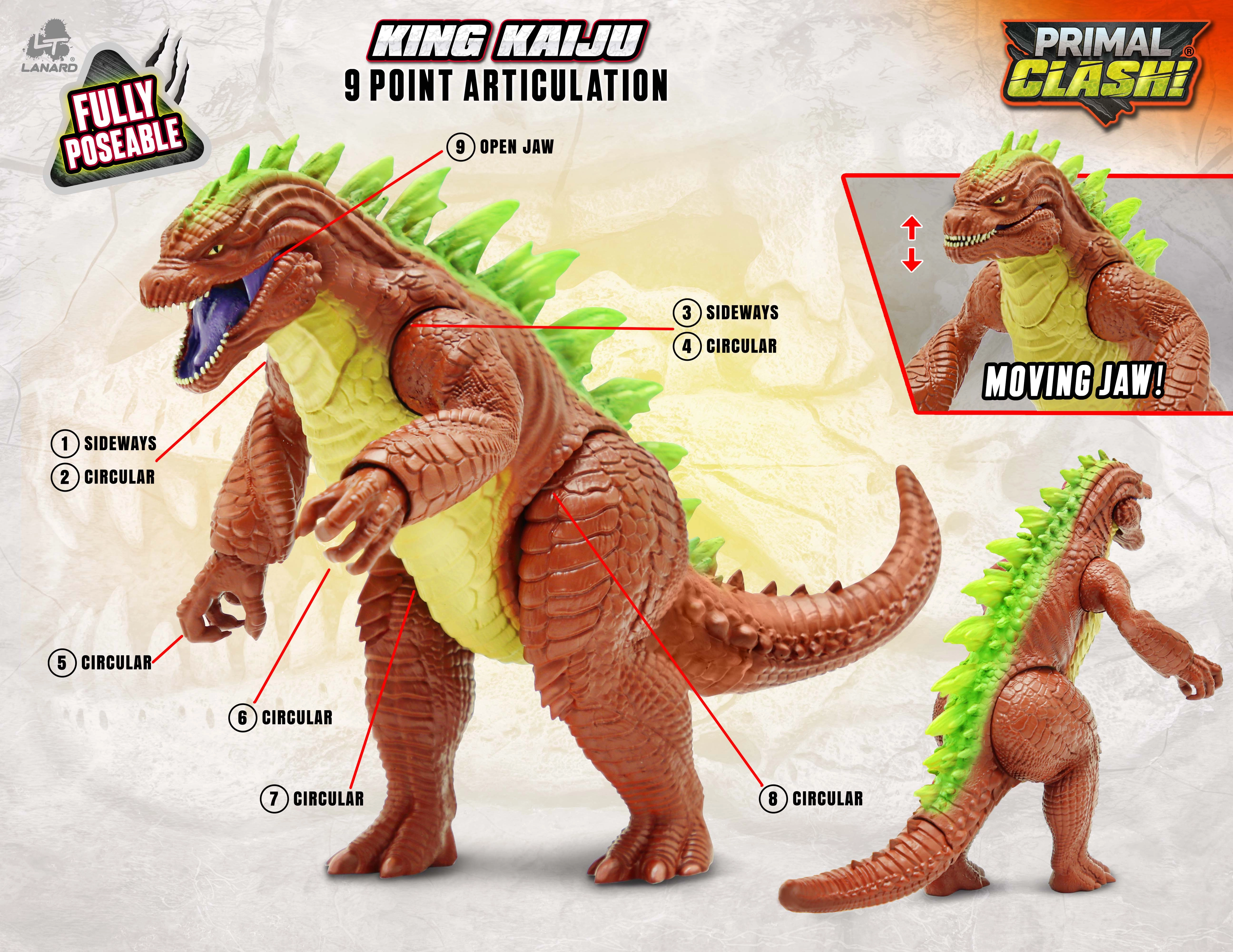 Découvrez la gigantesque figurine articulée Primal Clash King Kaiju d’une hauteur de 43 cm, avec des détails réalistes, des membres et une mâchoire mobiles. Assemblage facile – il suffit d’attacher la queue – puis lancez-vous dans des aventures imaginaires ou créez un display d’exposition.