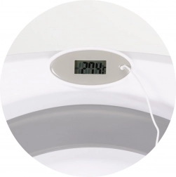 Le thermomètre intégré aide à régler la température idéale de l’eau. L’orifice d’évacuation avec bouchon pratique accélère la vidange sans soulever la baignoire.