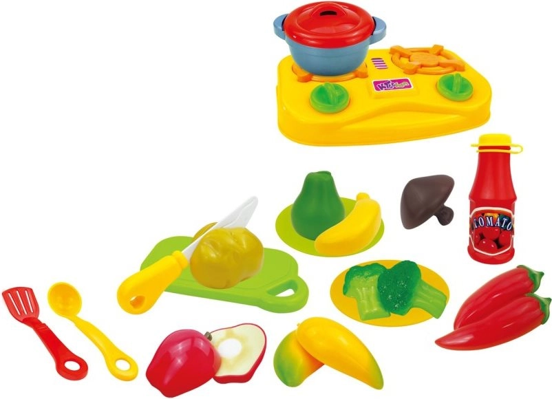 Un ensemble ludique pour la cuisine des enfants comprenant une sélection de fruits et légumes qui peuvent être « découpés » et rassemblés à nouveau grâce au velcro. Le panier pratique facilite le rangement et le transport. Idéal pour développer la motricité fine et jouer à cuisiner. Set de 17 pièces, aliments à découper avec velcro, panier pratique.