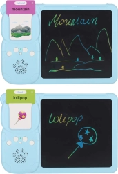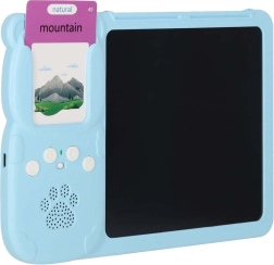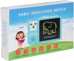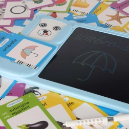 Le lecteur interactif avec tablette LCD développe le vocabulaire, la prononciation et la motricité fine. Il suffit d’insérer une carte et l’appareil joue la prononciation correcte du mot anglais – des catégories sélectionnées (animaux, véhicules) sont enrichies de effets sonores ludiques. Sur l’écran LCD 8", les enfants s’exercent en parallèle à écrire, dessiner et prendre des notes grâce au stylet fourni.