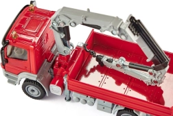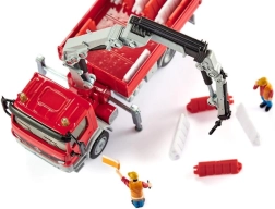 La grue, fidèlement reproduite, pivote et grâce à ses articulations atteint facilement la charge, que vous soulevez en toute sécurité avec le crochet.