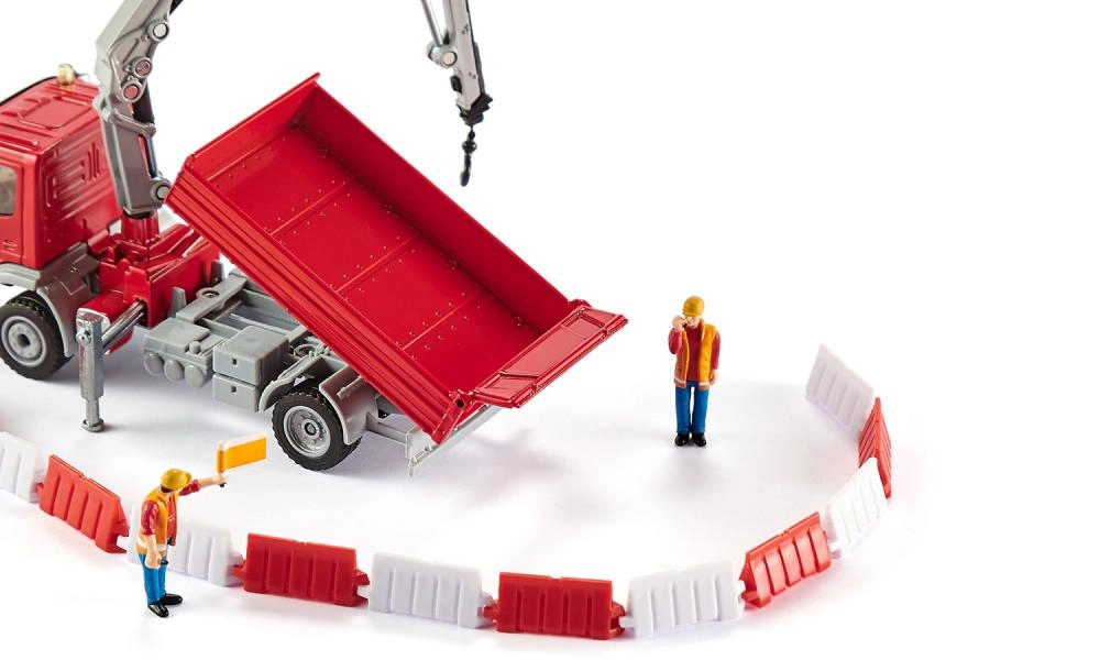 - Accessoires riches : 2 figurines d’ouvriers et barrières routières