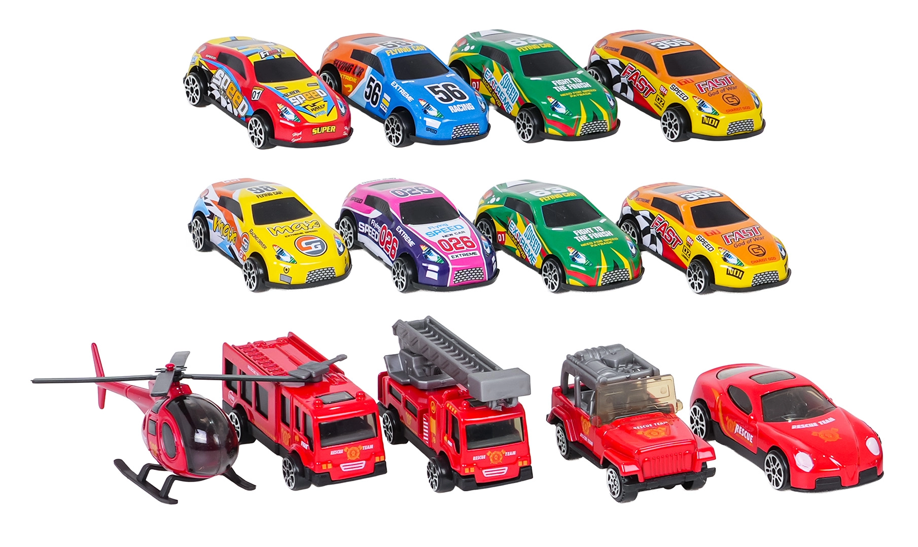 Le coffret comprend 12 petites voitures différentes, un hélicoptère avec aire d’atterrissage, des panneaux de signalisation, des barrières et des autocollants décoratifs.