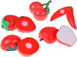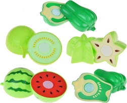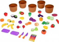 Deux planches à découper, deux couteaux et une variété de fruits et légumes de différentes couleurs stimulent l’imagination et le jeu de cuisine, de magasin ou de restaurant.