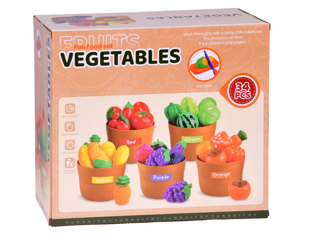 Le set comprend des paniers robustes avec étiquettes colorées, deux planches à découper et deux couteaux sûrs pour s’entraîner à la bonne prise en main et à la coordination œil-main. Le jeu développe la motricité fine, la pensée logique, le vocabulaire et la créativité.