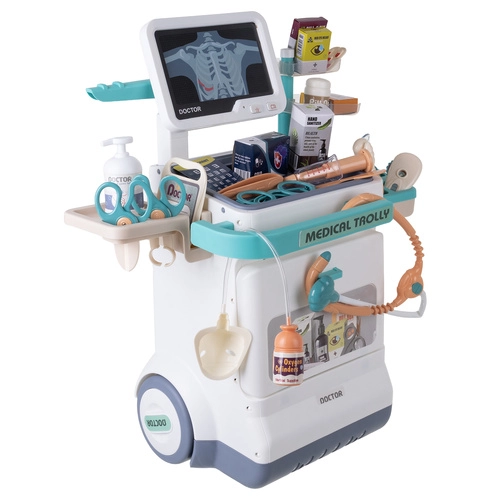 La station médicale pour enfants mobile offre un jeu de rôle médical réaliste à la maison. Le chariot à deux niveaux avec roulettes, écran ECG/Radiographie et riche équipement permet aux enfants de s’occuper des patients – peluches comme membres de la famille. Les effets lumineux et sonores (battements, signal ECG) stimulent la curiosité et illustrent le fonctionnement d’un cabinet.