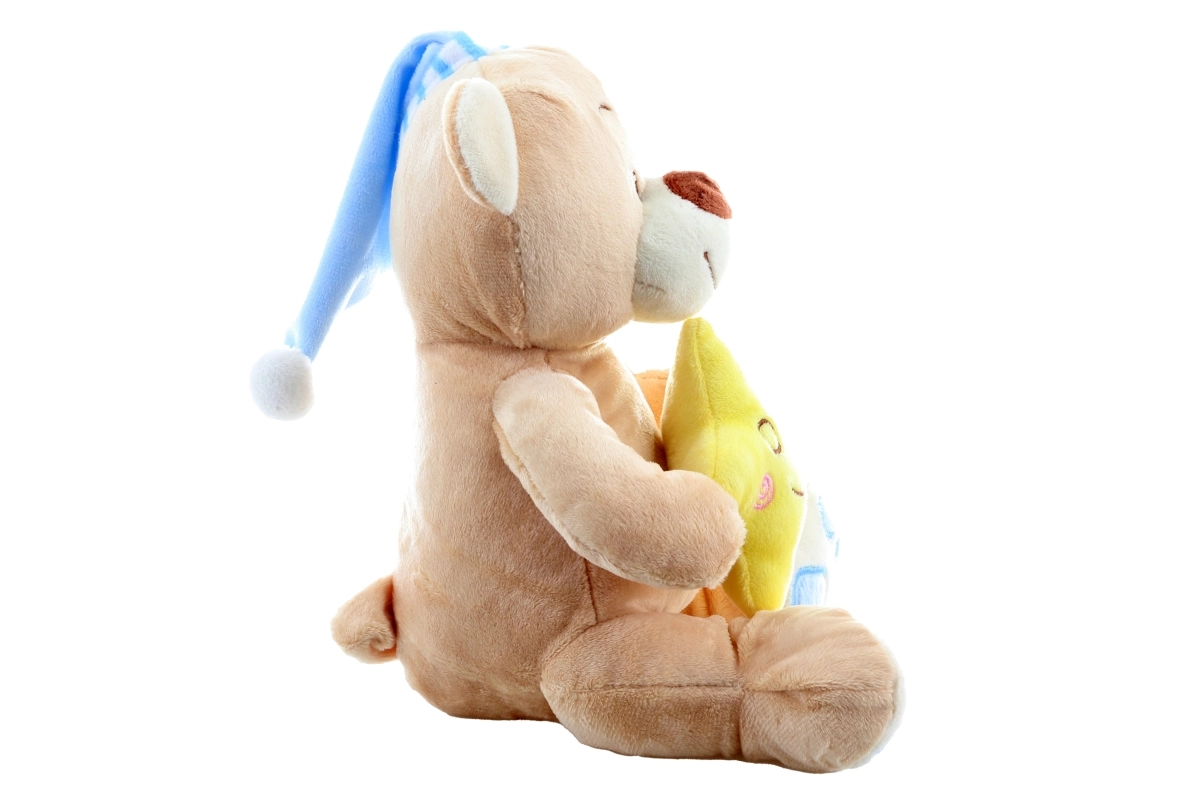 Ce tendre ourson en peluche avec bonnet bleu apporte aux enfants une sensation de calme et de sécurité. La petite étoile jaune entre ses pattes accompagne les rituels apaisants du coucher, tandis que les matières douces invitent aux câlins. Grâce aux yeux et au sourire brodés, le jouet convient même aux tout-petits.