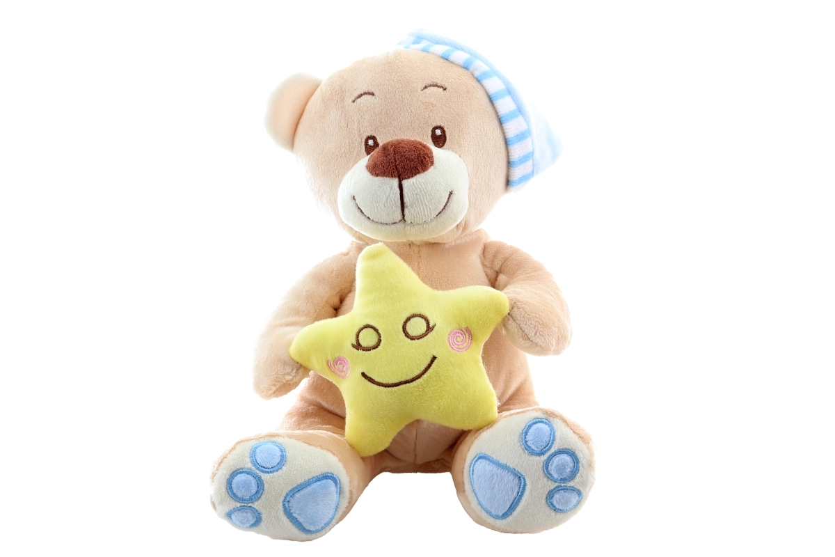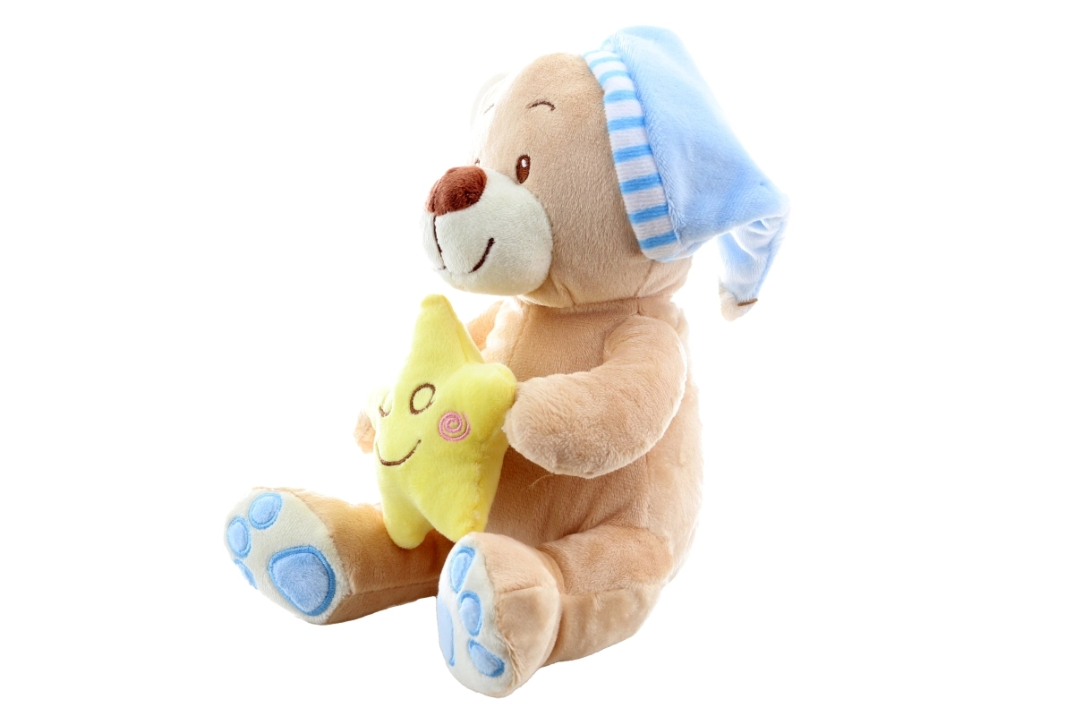 La peluche moelleuse, le bonnet bleu apaisant et la petite étoile jaune créent une atmosphère agréable avant le coucher.