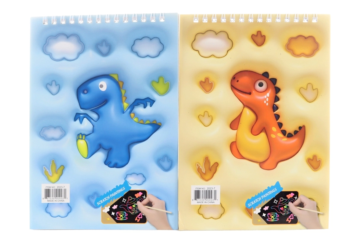 Carnet créatif à gratter au motif dinosaure, offrant des heures de divertissement aux enfants et stimulant leur imagination. Contient 8 feuilles noires avec fond coloré et un stylet à gratter en bois pour une création facile. Format compact 14 × 20 cm, idéal en voyage comme à la maison, et reliure spirale pour un feuilletage pratique.