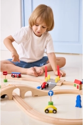 La structure en bois massif et les pièces robustes résistent au jeu quotidien. Un complément idéal aux sets de trains, petites voitures et panneaux de signalisation.