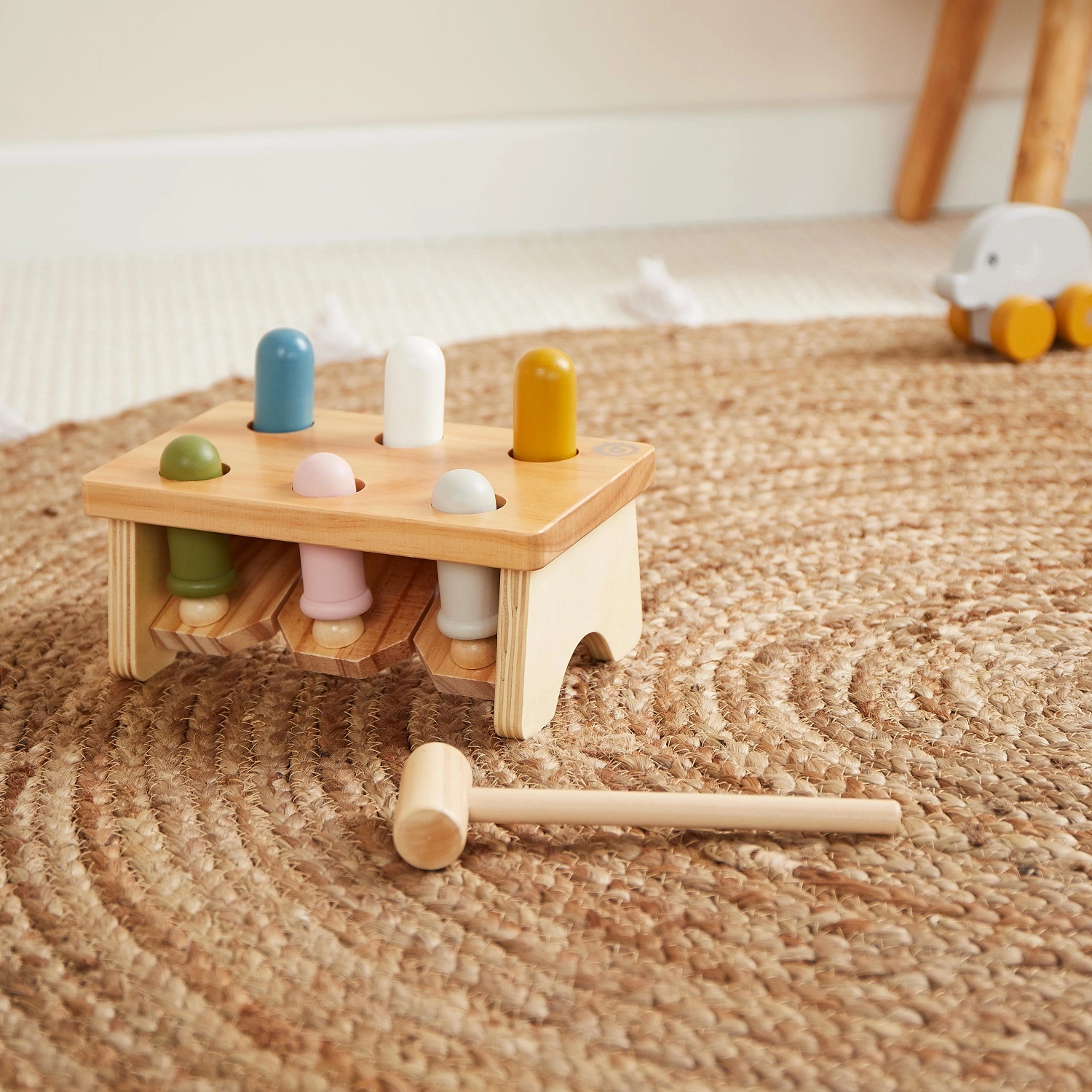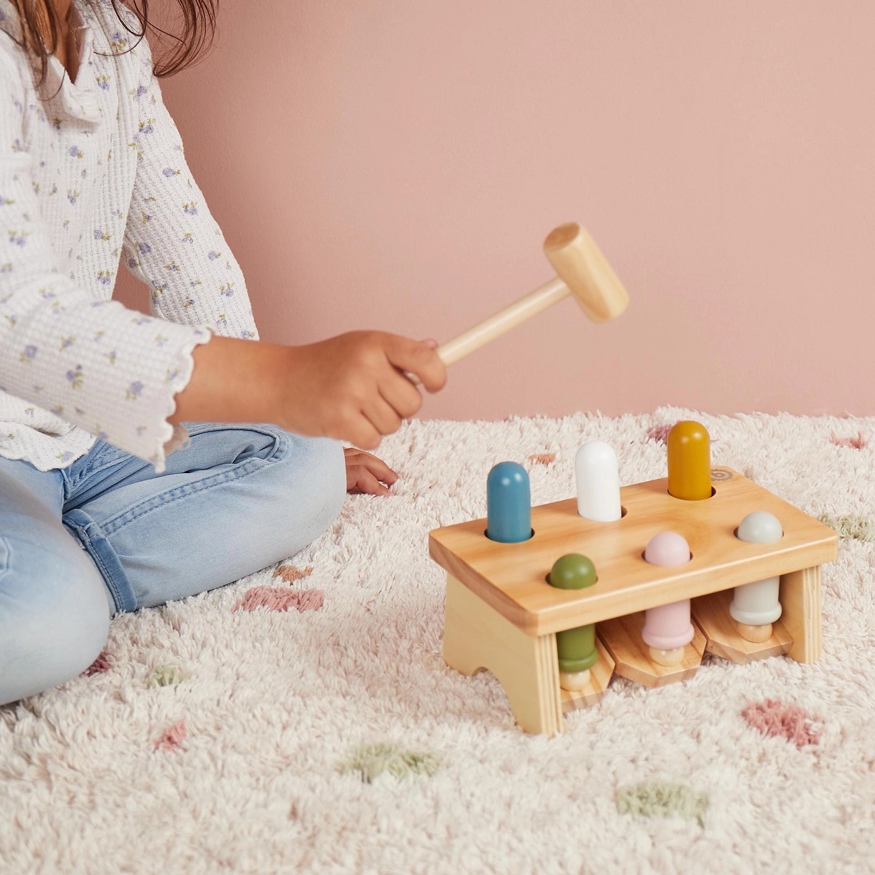 En martelant les chevilles, l’enfant travaille la précision de sa prise, la coordination œil-main et la concentration – idéal pour les premiers jeux moteurs.