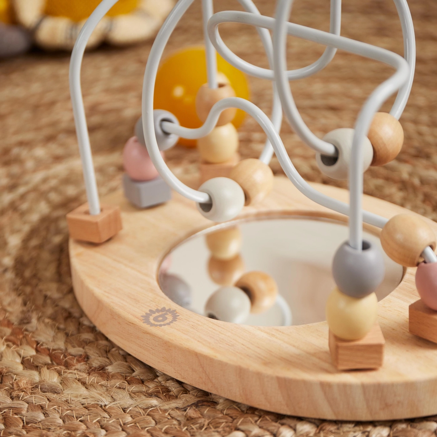 Ce labyrinthe moteur élégant dans des tons roses est un jouet idéal pour les premières compétences. En déplaçant les perles le long des pistes métalliques, les enfants exercent la prise, la patience et la perception spatiale. Le miroir central capte l’attention et soutient la conscience de soi ainsi que la perception sensorielle.