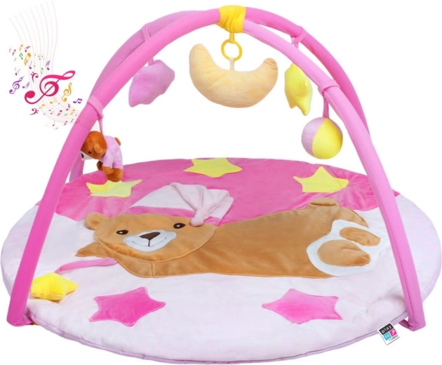 Ce tapis d’éveil éducatif original de couleur rose avec un adorable ours est conçu pour stimuler la vue, le toucher et l’ouïe. La lune renferme un module musical qui, lorsqu’on appuie dessus, joue de douces mélodies, tandis que les parties bruissantes et mobiles éveillent la curiosité de bébé. Le rembourrage moelleux garantit un confort maximal et un espace sécurisé pour ses premières découvertes.