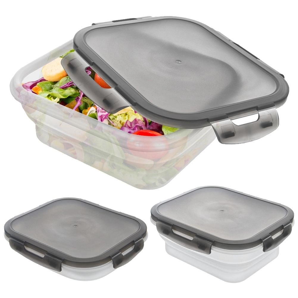 Une fois pliée, la boîte ne fait qu’environ 3,5 cm de hauteur, dépliée 7 cm (dimensions env. 19 × 16 × 7 cm). Les matériaux résistants sont adaptés au contact alimentaire, la boîte peut être lavée au lave-vaisselle et utilisée au micro-ondes sans le couvercle. Idéale pour les déjeuners au travail, les en-cas en excursion et le stockage des restes au réfrigérateur.