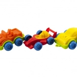 De petites voitures colorées de 10–12 cm se mettent en mouvement d'une simple poussée. Idéales pour développer la motricité fine et la coordination œil-main.