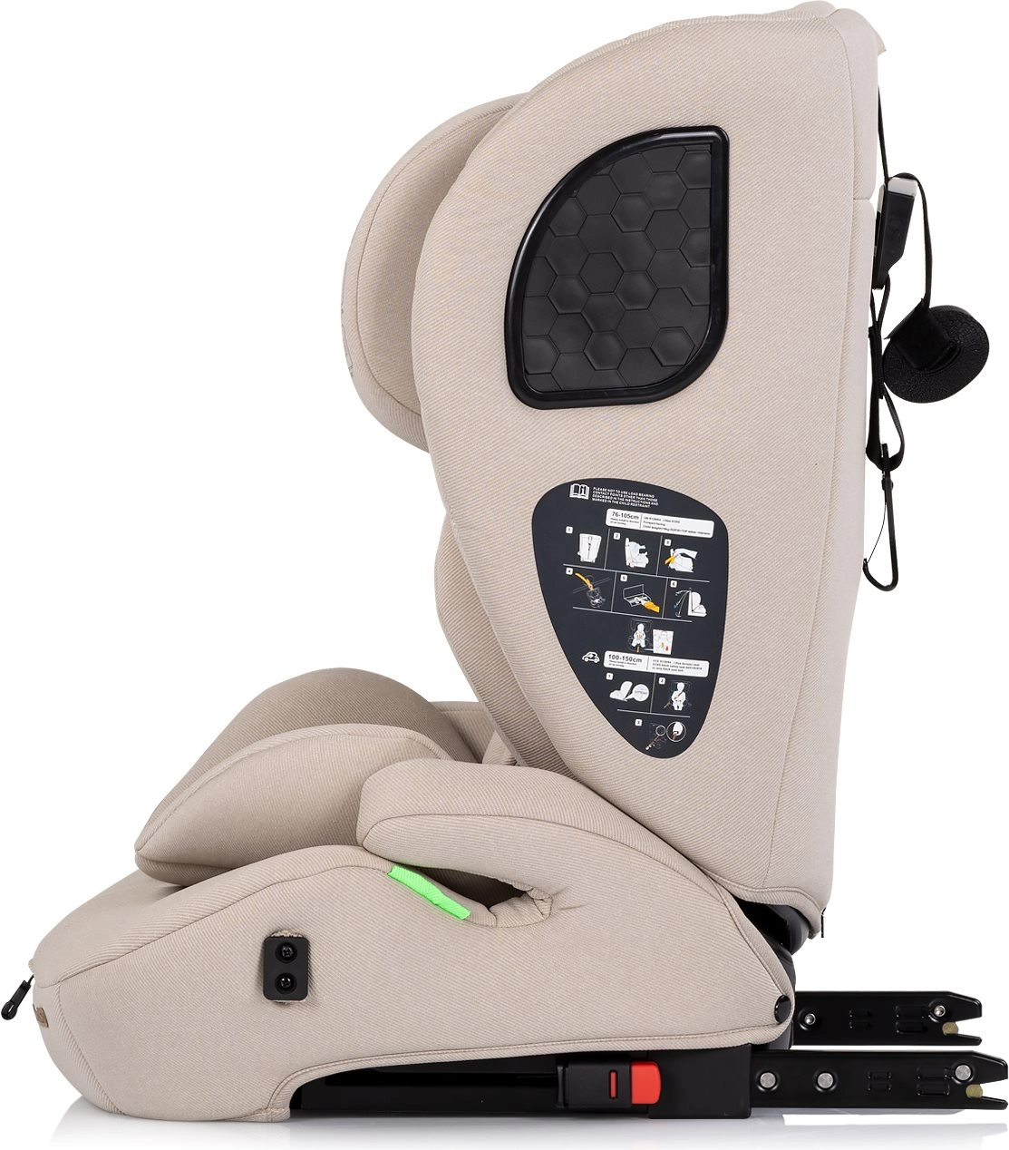 Fixation rapide et intuitive. Pour 76–105 cm avec harnais 5 points ; pour 100–150 cm, ceinture 3 points du véhicule avec possibilité d’utiliser l’ISOFIX.