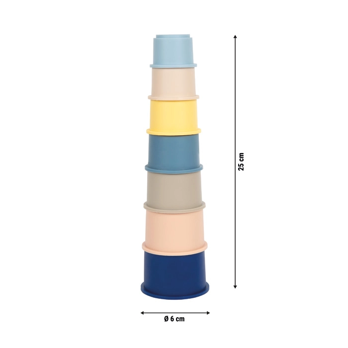 Les gobelets s’emboîtent pour gagner de la place. Le matériau résistant se nettoie aisément et convient au jeu à la maison comme en extérieur.