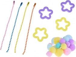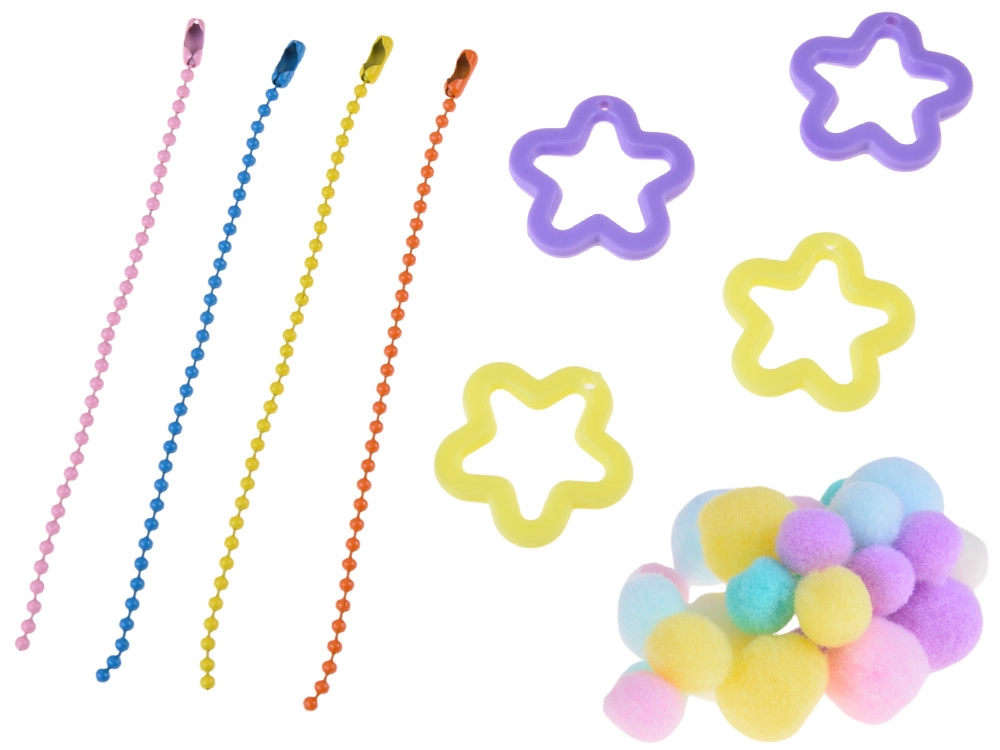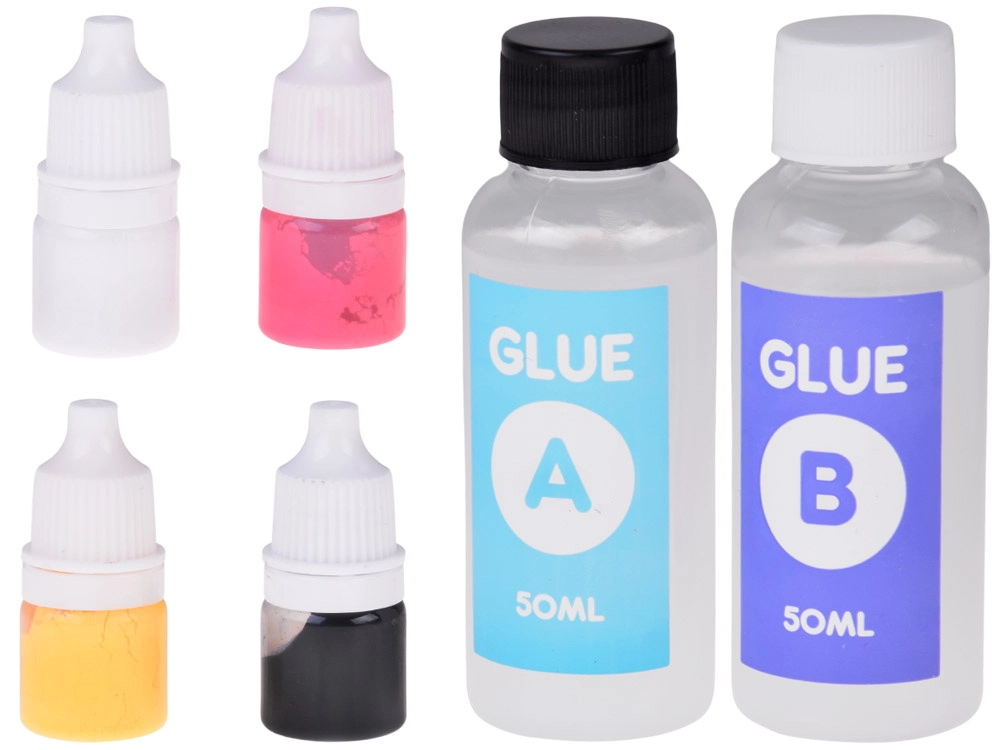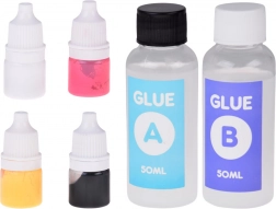- Moule pour 4 slimes, spatule de mélange, petit couteau en plastique, 2× colle (A+B), doseur, 4× colorant, billes décoratives souples, gants de protection, 4× étoile, 4× gobelet transparent, 4× sachet décoratif, 4× chaînette de porte-clés, plateau
