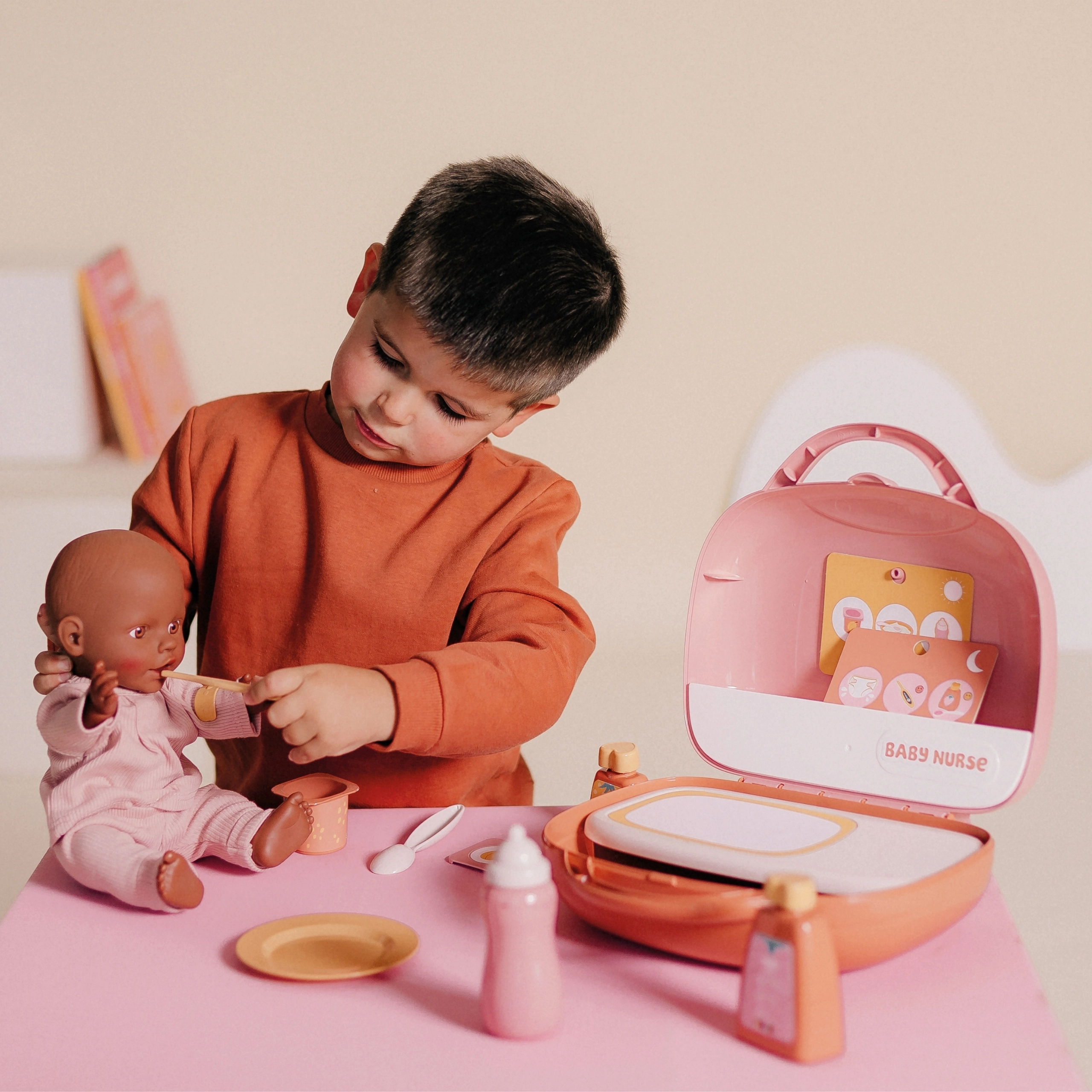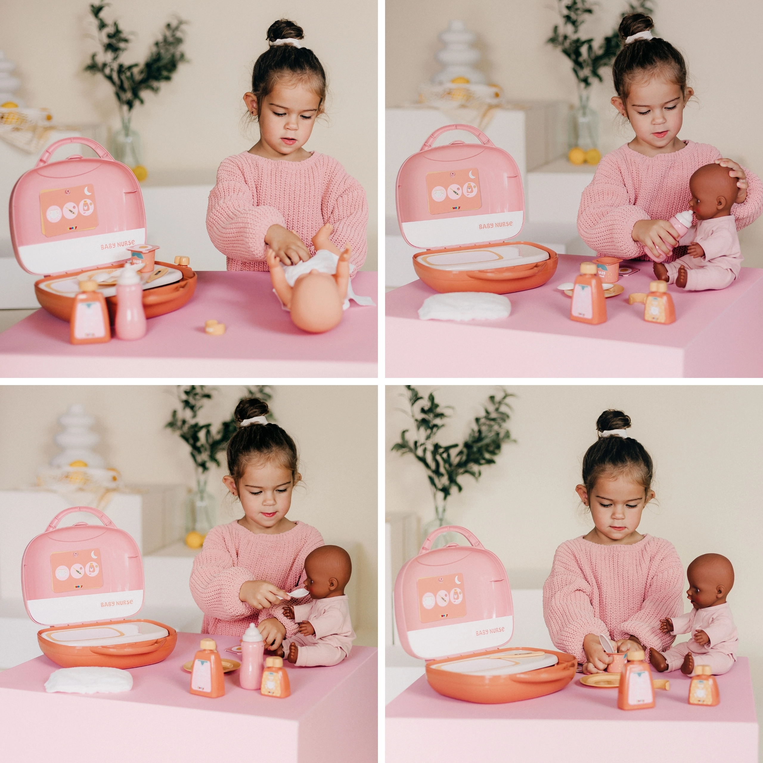 Le set Baby Nurse dans une valisette pratique offre tout ce dont les petits soigneurs ont besoin pour imiter de vrais soins de bébé. Les enfants peuvent nourrir la poupée (non incluse) avec le biberon, servir un « yaourt » dans l’assiette, vérifier la température avec le thermomètre et utiliser les flacons cosmétiques pour jouer à l’hygiène. Grâce aux cartes « jour » et « nuit », ils apprennent à créer des routines et des rituels de soins.