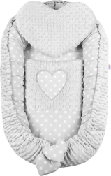 Le nid New Baby Cœur offre à votre bébé un espace douillet et protégé pendant les premiers mois de vie. Grâce à la combinaison du tissu doux minky avec reliefs 3D pour stimuler la sensomotricité et du coton 100 %, il est agréable au toucher et respectueux des peaux sensibles. La conception réversible permet de varier l’apparence et l’utilisation.