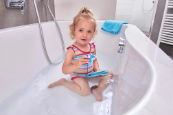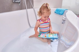 Sa structure légère flotte sur l’eau et est sûre pour jouer dans la baignoire ou la piscine. Les enfants feuillettent facilement et découvrent couleurs et formes.