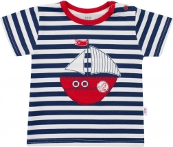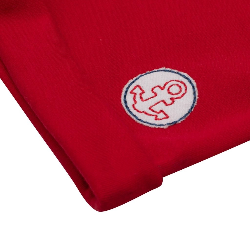 Le t-shirt rayé avec application bateau et le short rouge forment un ensemble stylé pour les petits marins.