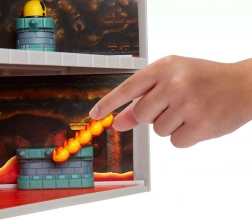 Revivez des moments emblématiques de SUPER MARIO dans l’environnement de jeu élaboré du Château de Bowser. La construction à deux niveaux dans des tons gris avec toits verts et les caractéristiques « rivets » apporte une atmosphère authentique. À l’entrée, vous serez accueilli par la tête de Bowser, l’une des tours active des mélodies du jeu, et l’intérieur prend vie grâce à l’ascenseur mobile, au verrou et à la cage à trappe.